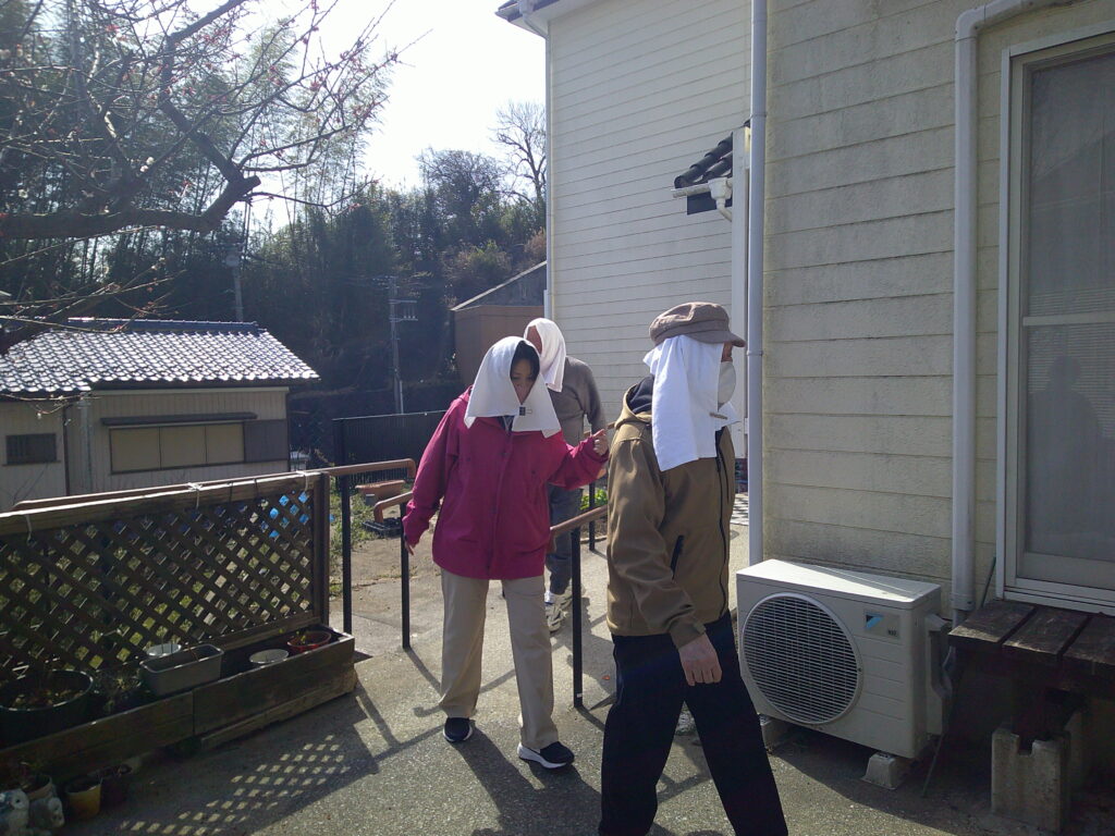 認知症対応型デイサービスは別棟になりますので、火災や災害発生時などの避難は近隣住民や皆さんの協力が必要不可欠になります。今回は認知症対応型デイサービスのご利用者、ご家族も訓練に参加していただきました。
